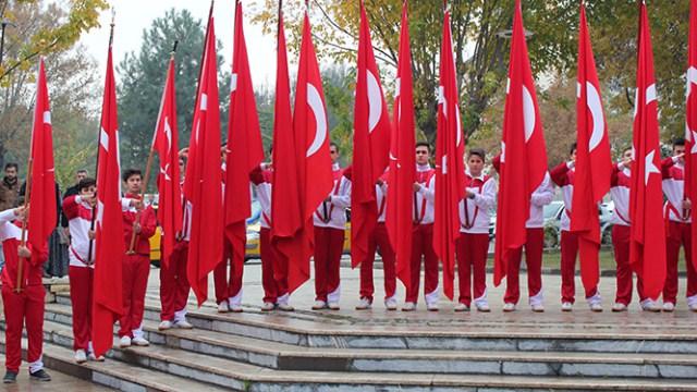 Saat 9’u 5 geçe çalan sirenler ile birlikte törene katılan kalabalık heyet saygı duruşunda bulundu ve İstiklal Marşı okundu. Bu esnada törene katılmayan duyarlı vatandaşlardan kimi Türk Bayrakları ile süslenmiş balkonlarda, kimi araçlarından inerek, kimi de kaldırımlarda saygı duruşunda bulunarak Ulu Önder Mustafa Kemal Atatürk’ü andı.